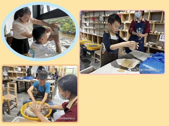 在陶器制作区,小朋友们在老师的帮助下,黏土在手中慢慢显现出不同的形状。