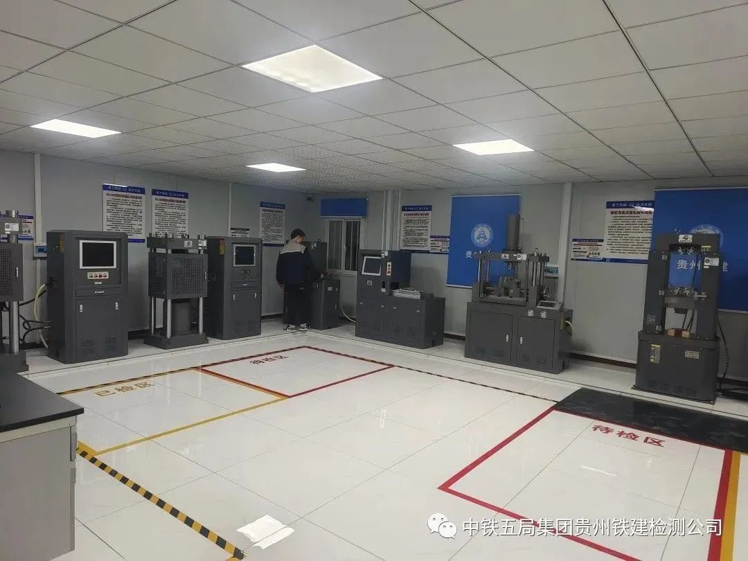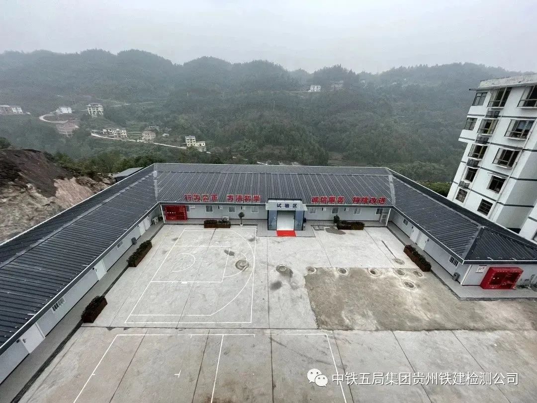 贵州铁建渝万高铁检测1标第三方检测及中心试验室占地2900m²,建筑面积1850m²,办公及生活区建筑面900m²,试验操作区占地1700m²,设有力学室、标准养护室、混凝土室、长期耐久室、胶凝材料室、化学分析室、高温室、静载锚固性能室、防水材料室、土工合成材料室、集料室、土工室、现场检测室等功能室,具备铁路混凝土原材全项,防水材料全项,金属材料物理性能,混凝土耐久性能,现场路基填筑质量、挡墙厚度、密实度,桩基完整性、强度,衬砌混凝土厚度、强度、密实度、背后空洞、钢筋及钢架分布情况,复合地基承载力,锚杆(锚索)拉拔力质量,钢结构焊接质量等检测能力。